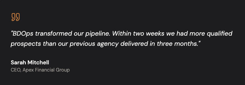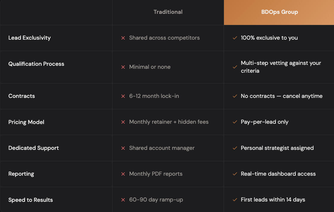 Bdops Group provides marketing and lead generation services only. We are not a broker, attorney, or licensed financial advisor. No specific results, revenue, or conversions are guaranteed.Compliance